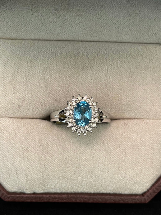 Oval Blue Topaz w/ Double Diamond Halo Ring