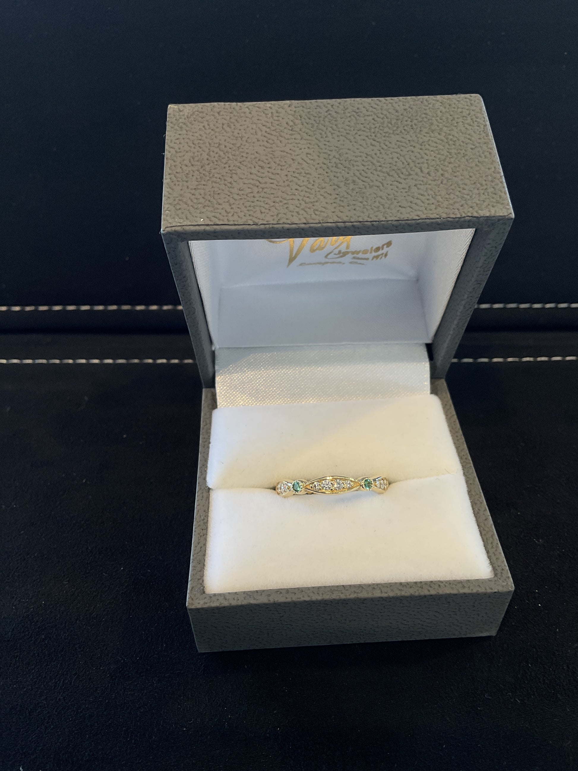 Round Brilliant Cut Beaded Bezel Set Emerald and Prong Shared Diamond 14KT Yellow Gold Stackable Ring