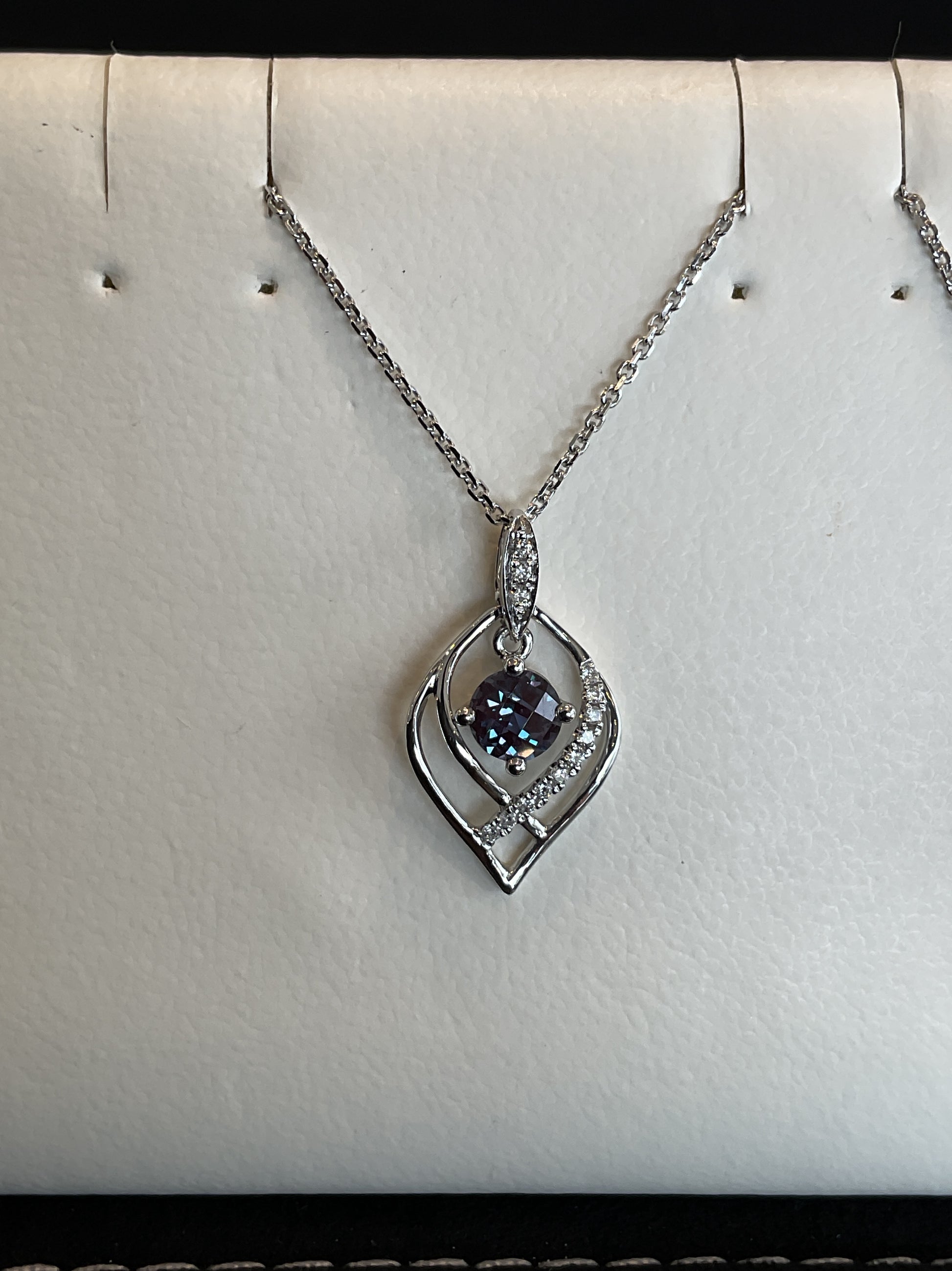 Round Cut Lab Alexandrite with Round Brilliant Cut Diamond Accents 14KT White Gold Dancing Drop Necklace 18" 14KT White Gold Chain