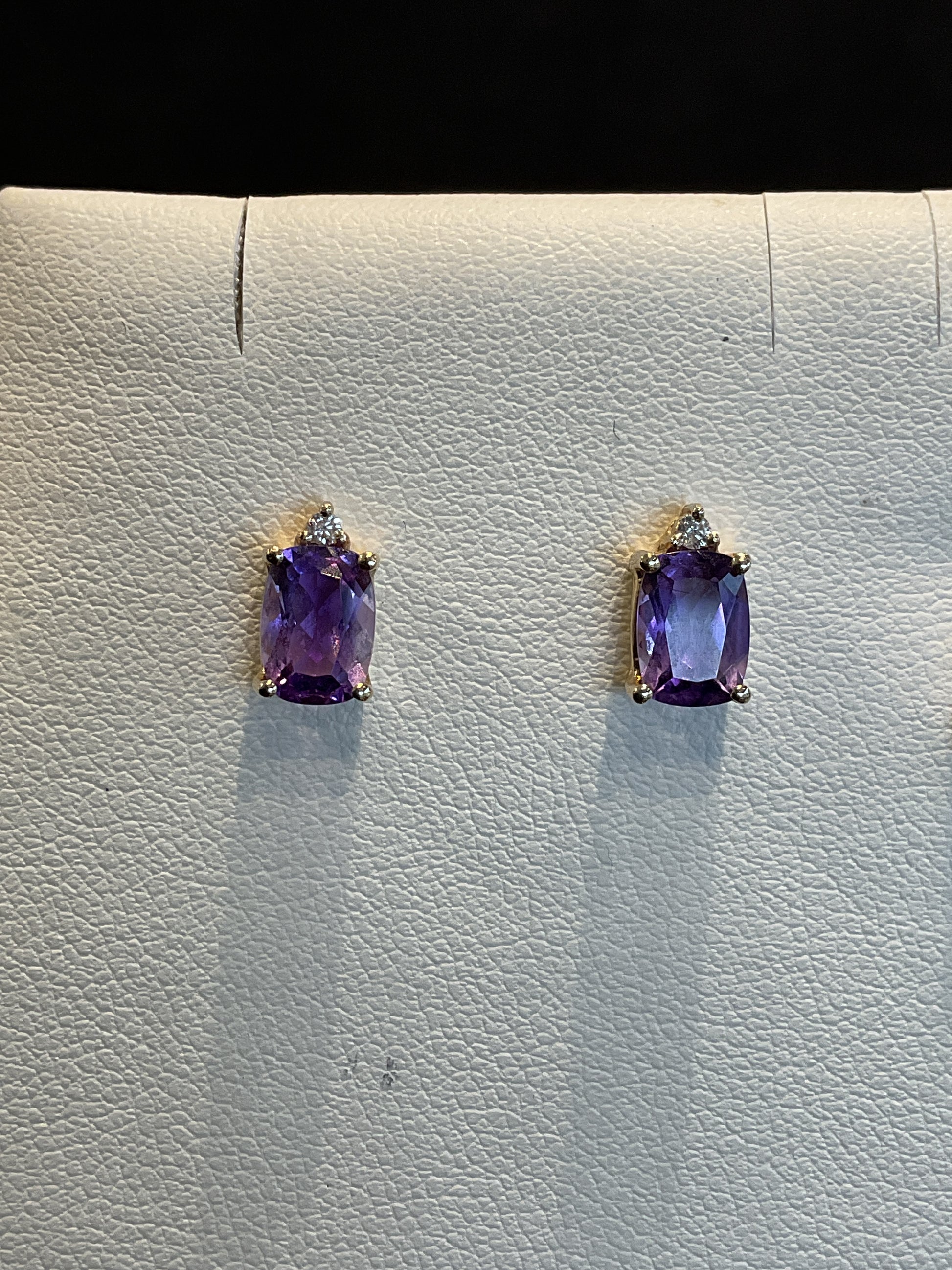 Elongated Rectangle Cut Purple Amethyst 14KT Yellow Gold Stud Earrings with Single Round Brilliant Cut Diamond Accent