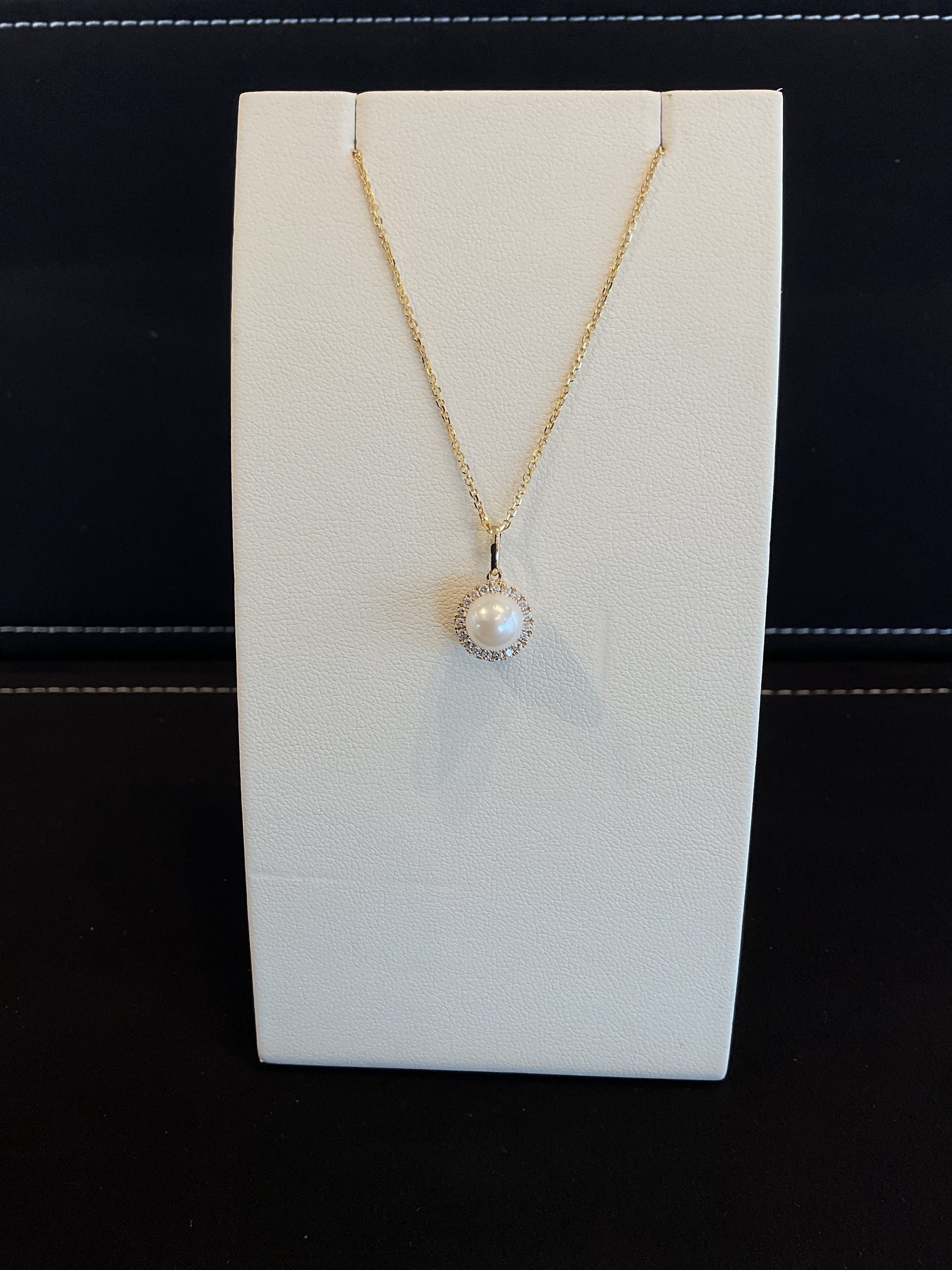 Cultured Pearl with Round Brilliant Cut Diamond Halo Setting 14KT Yellow Gold Necklace 18" 14KT Yellow Gold Chain