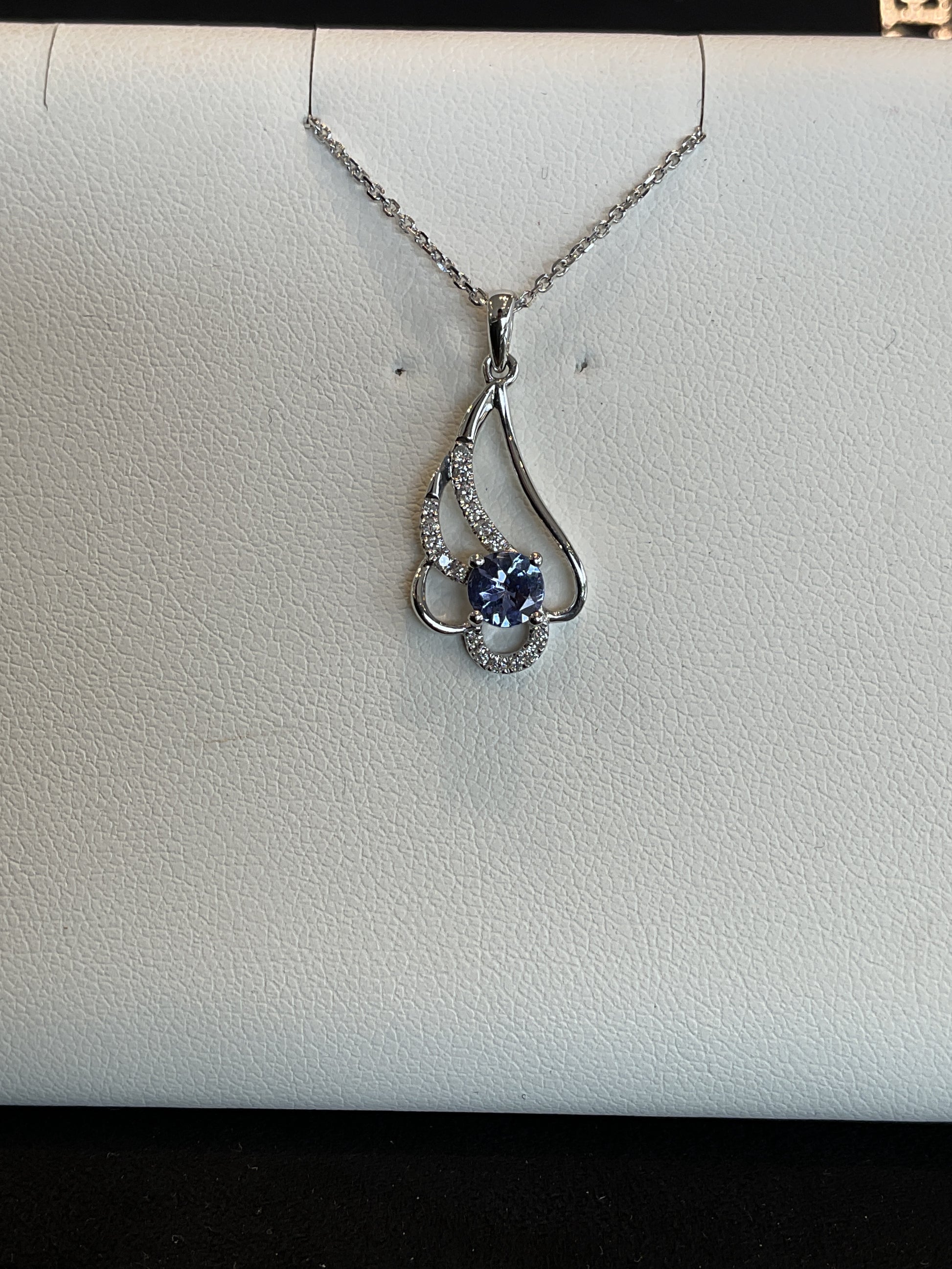 Round Cut Tanzanite with Round Brilliant Cut Diamonds in Petal Design 14KT White Gold Necklace