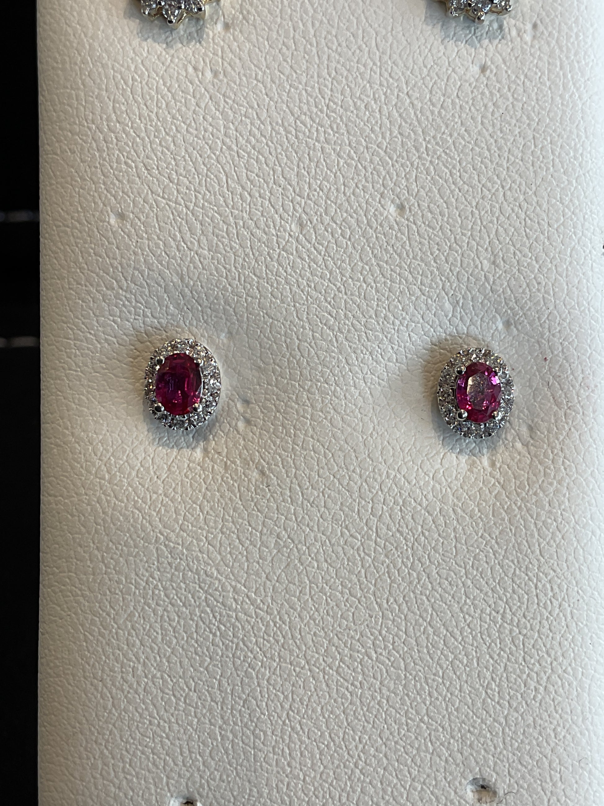 Oval Cut Red Ruby with Round Brilliant Cut Diamond Halo Prong Set 14KT White Gold Stud Earrings